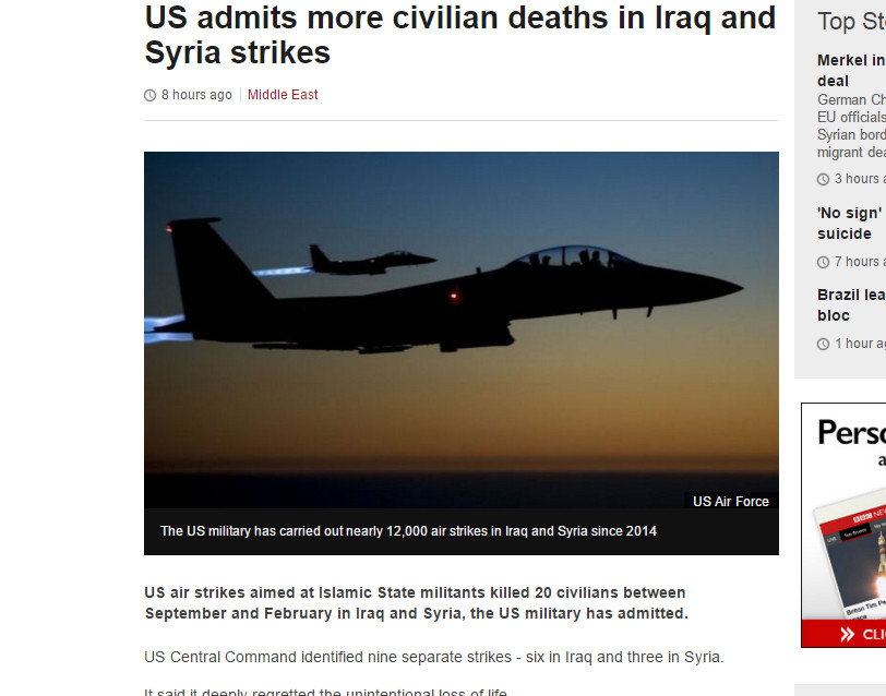 美軍中央指揮部巴格達事務發言人萊德((Col Patrick Ryder)22日表示,自2015年9月至2016年2月為掃蕩伊斯蘭國所進行的9次空襲,共有20名市民不幸喪生,總花費共70億美元(2,240億新台幣)。