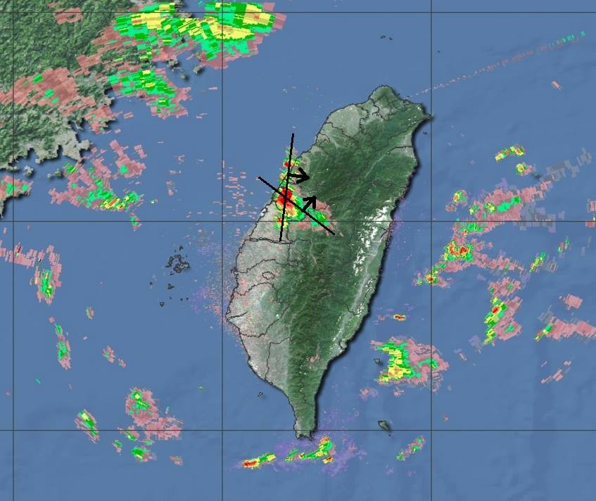 不過,鄭明典說,這個對流胞是在接近台中時,海峽上由西側移入約略呈南北走向、非常微弱的零散回波,就在上述2個接近線狀回波交會處,「一個接近單胞結構的強對流雲發展起來」,這應該是不同中尺度對流系統產生的邊界層外逸流,交會所激發出來的對流胞。