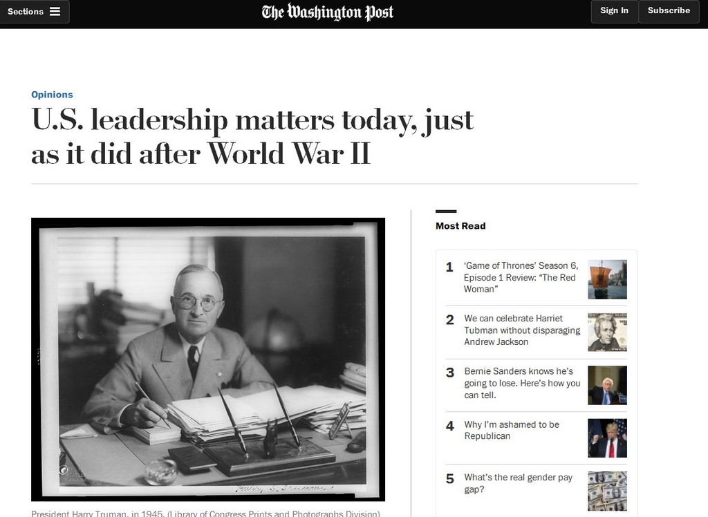 人們都知道後來的結果怎麼樣。民主在專家堅稱不適合民主存在的土地上繁衍茁壯。歐洲、東亞與北美一樣變得非常現代化,更反過來幫助美國變得更加富有。扣除通貨膨脹因素,美國的中等家庭年收入從1945年的2.7萬美元成長到現在的6.2萬美元。美國的持續駐軍維護了歐洲和東亞前所未有的盛平。