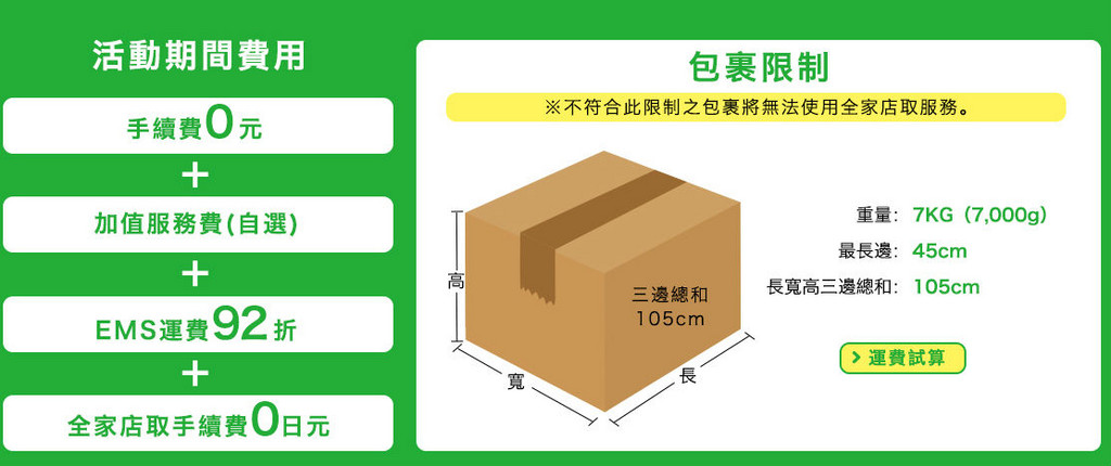 找網購、代購日本商品,怕麻煩又擔心有風險嗎?全家便利商店結合樂一番日本網購轉運回台的跨境服務,提供民眾包括業界最便宜價格、首創理賠優先、人工即時客服等服務,即日起至6月底,全面免手續費+免全家店取費+國際運費EMS 92折,以包裹1公斤至5公斤的費用從1,656~5,520日幣不等。