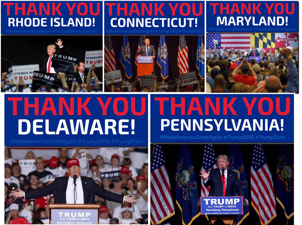 川普在康乃狄克州、德拉瓦州、馬里蘭州、賓夕法尼亞州和羅德島州分別以59.7%、61.1%、54.9%、57.3%、64.5%的支持率,遙遙領先克魯茲和卡西奇。