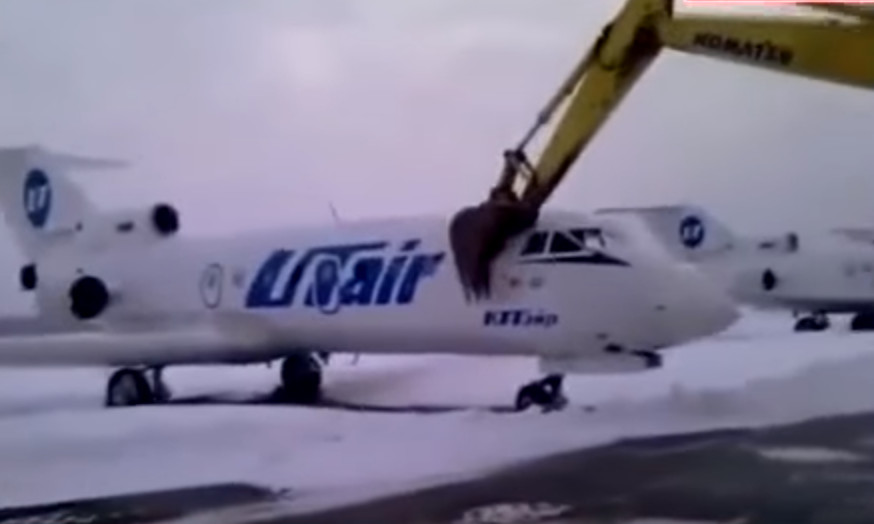 據外媒報導,整起事件發生在4年前,但影片最近才被公開,網友看了後瘋狂轉載。從客機機身可看到屬於俄羅斯的烏塔航空(UTair),型號為Yak-40,影片中男子坐在挖土機裡,朝著客機伸出怪手,機身立刻出現一道裂縫,還因重擊而輪胎下陷。