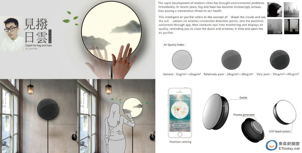 亞大商設系指導老師劉美均指出,「撥雲見日」的構想是從大陸霾害嚴重影響全球空氣品質,拉起警報的議題開始發想,希望讓「空氣清淨器」在生活中以較為有趣,貼近生活的方式,融入整體居家環境。