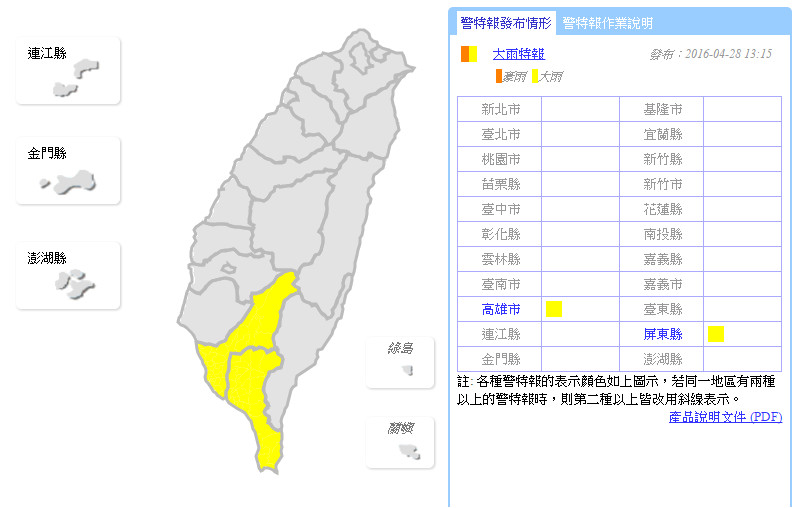 受到對流雲系發展旺盛,易有短時強降雨情形發生,氣象局28日下午13時15分針對高雄及屏東地區發布大雨特報,提醒民眾有局部大雨發生的機率。而後,14時55分針對屏東地區,氣象局又發布「豪雨特報」,尤其屏東瑪家鄉現已有局部豪雨,南投山區也列入大雨特報範圍。另外,台東地區也會有局部較大雨勢,氣象局提醒,請注意瞬間大雨、雷擊及強陣風。