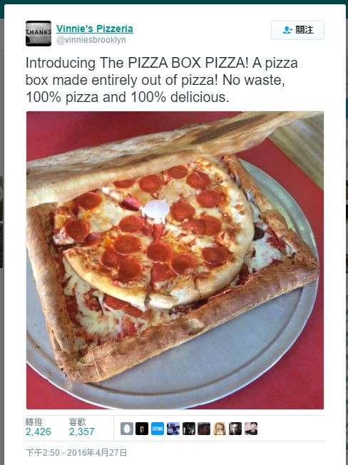 位於美國紐約布魯克林的「文尼披薩店」(Vinnie’s Pizzeria)推出了一款全新的超環保披薩。除了披薩本體外,它連外盒都是用披薩做的,讓大家吃飽喝足後根本不用擔心垃圾處理的問題。