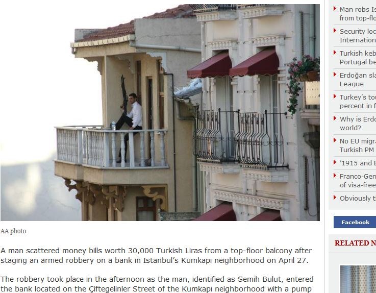 土耳其伊斯坦堡日前發生一起令人匪夷所思的搶案,怪盜布魯特(Semih Bulut)持槍搶銀行後不逃走,反而爬到銀行頂樓的陽台,把贓款全部灑到馬路上。