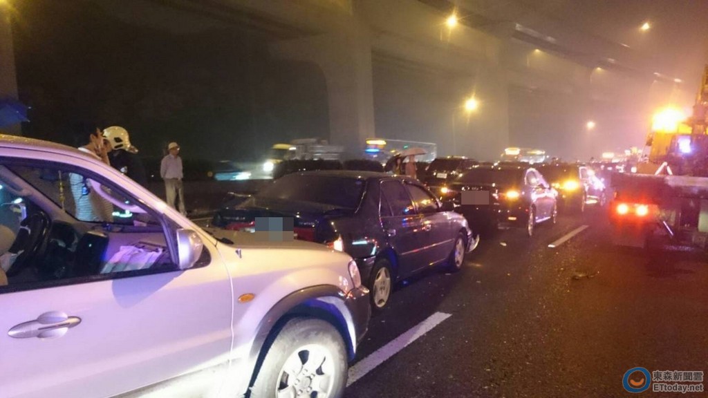 ▼國道1號林口段堵3車道。(圖/新北消防局、翻攝爆料公社)