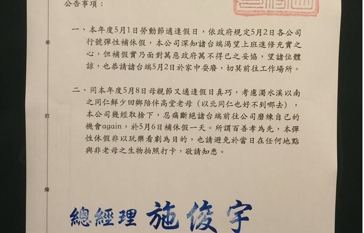以詼諧有趣的言詞取代傳統制式的公文,而公告也提到母親節連假:「母親節又適逢假日真巧,考慮濁水溪以南同仁鮮少回鄉陪伴高堂老母(以北同仁也好不到哪去),本公司幾經取捨下,忍痛斷絕諸台端前往公司磨練自己的機會again,於5月6日補休假一天。所謂百善孝為先,本彈性休假非以玩樂看劇為目的,也請避免於當日在任何地點與非老母之生物拍照打卡,敬請知悉。」