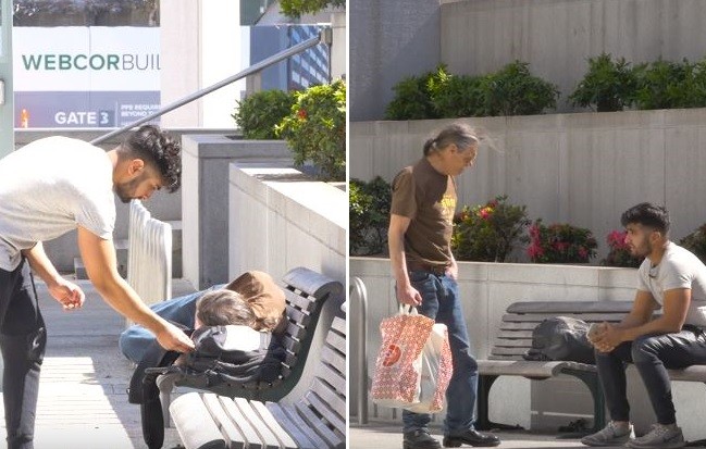 影片中可見,Johal塞了一筆錢給一名躺在長椅上熟睡的街友,隨後便躲在角落「監視」對方的反應。只見該名流浪漢起床後看見身旁多了一筆意外之財顯然非常開心,於是快步前往超商購買了兩大袋物品,之後又回到原本的長椅上休息。