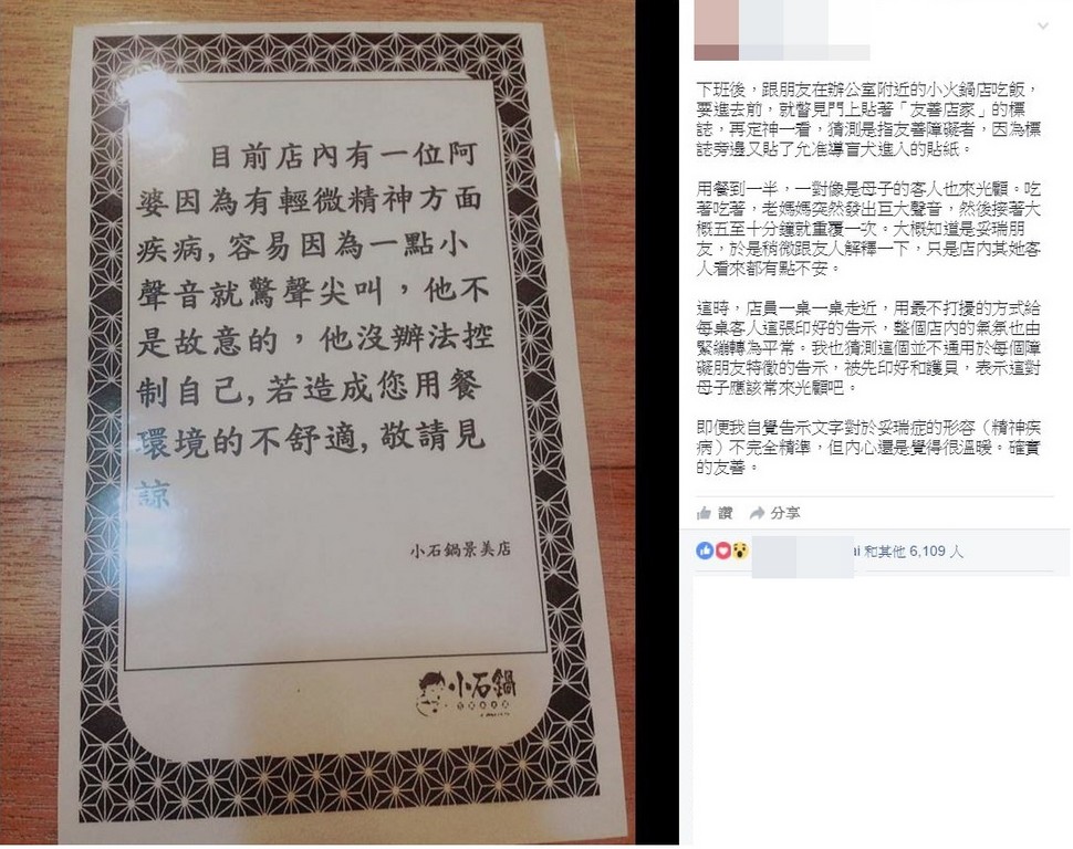 但店內的其他客人卻看起來有些不安,此時,「店員一桌一桌走近,用最不打擾的方式給每桌客人這張印好的告示」,告示中寫著,「目前店內有一位阿婆因為有輕微精神方面疾病,容易因為一點小聲音就驚聲尖叫,他不是故意的,她沒有辦法控制自己,若造成您用餐環境的不舒適,敬請見諒。」女網友說,客人們看完告示後,店內的氣氛也由緊繃轉為平常。