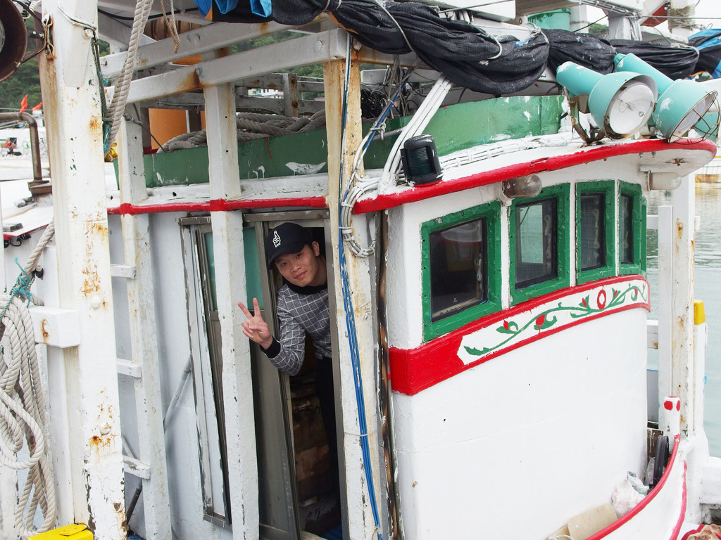 很多人會趁著好天氣到新北市金山玩,不知大家是否有注意到,那裡的「磺港漁港」旁停著一艘拉風的白色漁船,船上還有位帥氣的男子會拿著魷魚, 俐落指揮外籍漁工為晚上的出海作準備,而這位簡至呈就是「三協順16號」漁船的少東。