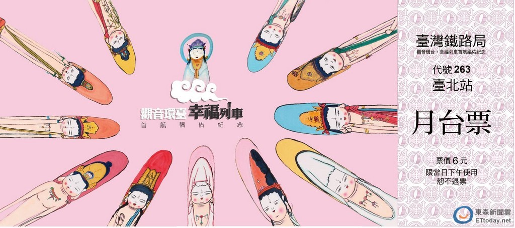 ▲觀音列車紀念月台票會有Q版觀音現身。(圖/台鐵提供)