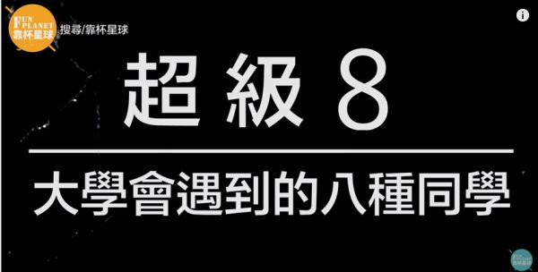 不少人進入大學之後,因為同學來自各地,也因此都會遇到一些怪咖。最近知名影音團隊「靠杯星球Fun Planet」日前推出新作品,片名是「大學會遇到的八種同學」,你看看身邊的同學、或者是你自己本身是不是這八種其中之一呢?