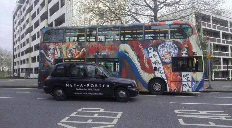 ▲在英國倫敦的台灣公車廣告,以「官將首」為主題。(圖/翻攝姚文智臉書)