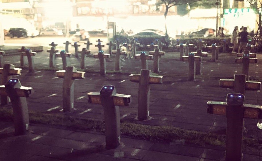 網友在貼文表示,「有沒有人發現,當ubike被借完之後...它就變成國外的墓園了」。只見Ubike的自動服務機像是一個個十字架,黑夜中上面的燈光也更顯詭異,放眼望去還真有點像...。