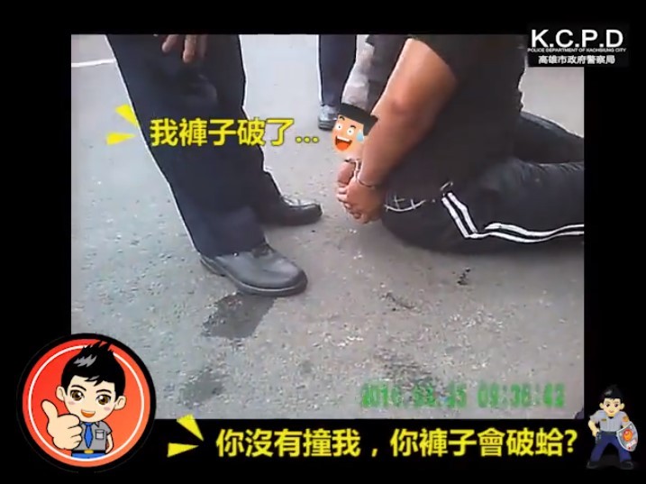 警員被衝撞加拖行,所幸沒讓男子跑掉,將他壓制在地上銬,「跑,什麼案件在身上要跑…先報身份證字號,別再搞怪了,回去查也有」;但男子堅稱想不起來,還抱怨「我褲子破了」,讓警員聽了直呼「你沒有撞我,你褲子會破掉?蛤?」警方經「人臉辨識系統」查出男子是竊盜、肇事逃逸通緝犯,依法送辦。