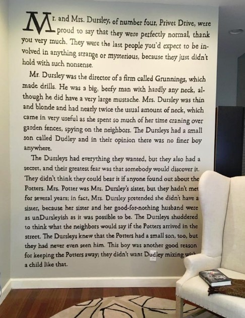 美國佛羅里達州1名年輕女作家麥樂迪斯(Meredith McCardle)因為非常喜歡JK羅琳的《哈利波特》系列小說,決定將《哈利波特》小說第一頁寫在家中的牆壁上,近日花了60個小時,終於完成這項「浩大工程」,讓不少人直呼太酷了!