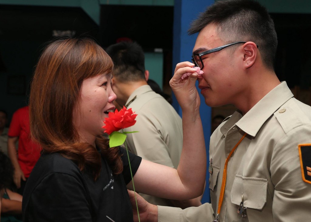 ▲感恩母親節!憲兵獻上手作康乃馨,母親感動落淚。(圖/翻攝自國防部發言人臉書,下同。)