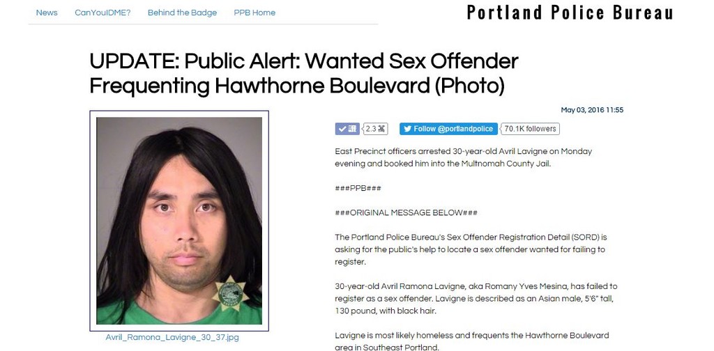 隨後他為了掩飾身分,在2014年申請改名成功,與加拿大女歌手艾薇兒同名同姓。但是他仍舊逃不過警察的追捕。而昨天波特蘭警察局宣布他已在2日遭到逮捕,並送入蒙諾瑪郡立監獄(Multnomah County Jail)。