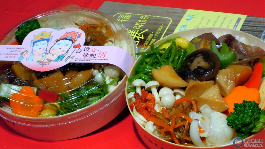 這次一共推出2種口味,養生蔬食Q便當以及迷迭香雞腿排便當,便當腰帶上更有本次台鐵觀音聯合畫展邀請展出的藝術家洪啟嵩老師所彩繪的Q版觀音,造型歡喜可愛。2款便當於5月5日當日台北站台北鐵路餐廳限量試賣各50個,每個售價皆為100元,售完為止。