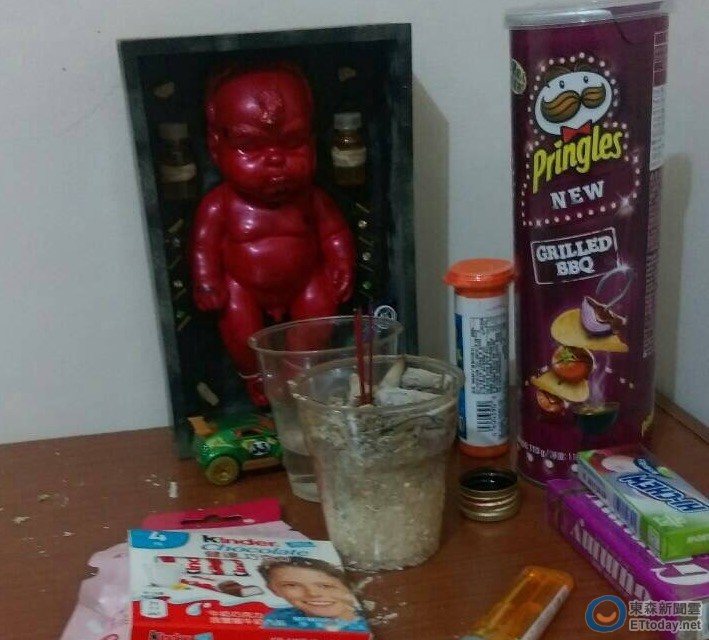 詐騙集團也信養小鬼?台北市刑大偵三隊經過數月埋伏追查,日前在桃園市攻堅一處詐騙集團機房時,赫然發現機房內竟然供奉一尊「小鬼」。貢桌上除了有自製玻璃杯香爐,還擺滿餅乾、糖果零食。