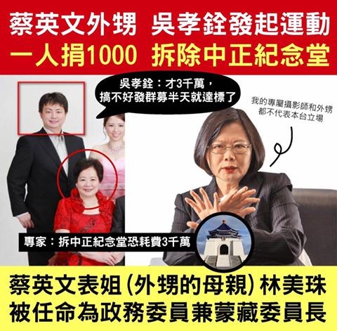 近日「中正廟存廢與否」議題炒得火熱,網友「Dominic Wu」在臉書發起「一人一千塊,大家一起拆除中正廟」聯署活動,盼集資3000萬自行拆除中正紀念堂。國民黨政策會執行長蔡正元5日在臉書表示,發起聯署活動的網友,就是蔡英文的外甥,但今查詢後發現,臉書聯署活動已被取消。