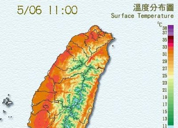 根據氣象局資料11時45分的資料,全台前5名高溫分別是台北34.6度、嘉義33.7度、板橋33.4度、基隆33度、大園32.3度。台北34.6度已創下今年最高溫紀錄。