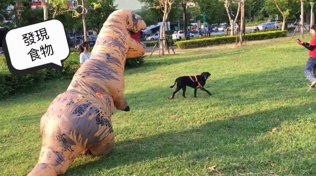 當然,餓著肚子的恐龍最重要的一件事是「找食物」,他先在大草皮上見到一隻黑狗出沒,「發現食物,本龍吃一口就好」。不料黑狗警戒心很重,看著龐然大物逼近自然不斷逃離;恐龍哥只好鬼鬼祟祟試圖接近,無奈最後還是被敏銳的黑狗發現,功虧一簣。