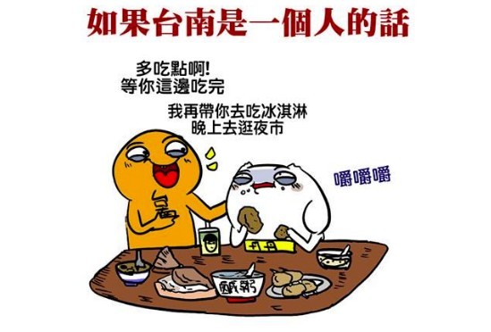插圖以上下兩格呈現,寫道「如果台南是一個人的話,那他大概就是那種把你肚子搞大就不理你的負心漢」,插圖中名為台南的主角不斷慫恿好友吃東西,邪惡笑說「多吃點啊!等你這邊吃完。我再帶你去吃冰淇淋,晚上去逛夜市。」