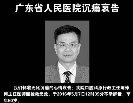 據《中國新聞網》報導,廣東省人民醫院今在微博發表聲明,哀痛宣告先前遭砍傷的退休口腔科主任醫師陳仲偉傷重不治,享年60歲。據了解,陳仲偉5日在家時,被1名自稱是25年前的病患連砍數刀情況危急。