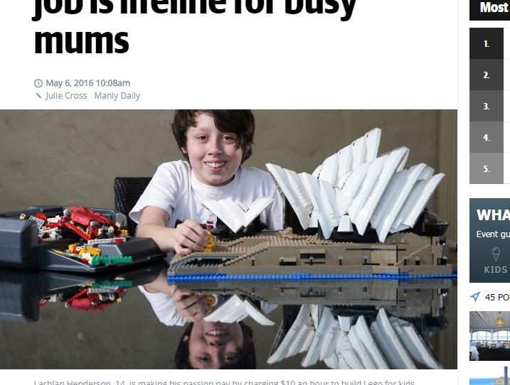 根據澳洲《每日電訊報》報導,14歲的亨德森(Lachlan Henderson)從小就十分擅長堆樂高,他的母親珍妮弗某天突發奇想,決定幫兒子將興趣轉換成一種賺錢的優勢,「他有一個十分擅長『構築』的腦袋,以他這個年紀來說是很難得的能力。」