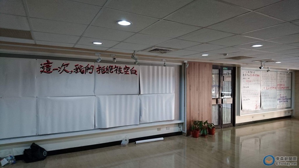 策展小組為了不為難基層行政人員,只好暫時將作品撤出後廊,並將作品反白,寫下事件的過程,作為無聲的抗議,並且讓同學們自由書寫對事件的看法。