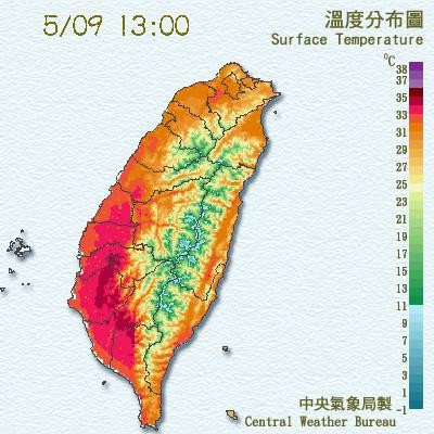 截至9日下午13時30分,全台4測站高溫打破今年記錄,嘉義下午13時06分出現35.4度高溫、台南上午11時37分出現33.8度高溫、新屋31.1度、高山測站玉山則是18度。中央氣象局預報員謝佩芸表示,今天整體環境吹偏南風,暖空氣環繞,且天氣晴朗、無雲,因此溫度偏高。氣象局也發布即時訊息,嘉義有機會出現36度以上高溫,請民眾注意防曬、多補充水分,預防中暑。