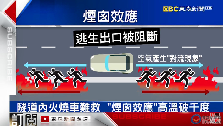 隧道內如發生火燒車意外往往容易波及其他人車,這是因為「煙囪效應」的關係,氧氣會往隧道兩端流動,火也就跟著燃燒,而這樣的方向也正好和民眾逃難相同,而隧道內都有三大防線,將風險減到最低。