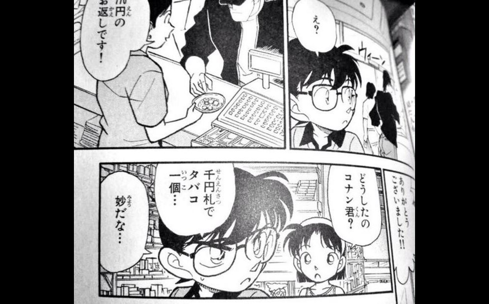 日本網友在推特上貼出一頁《名偵探柯南》漫畫,打趣表示「這孩子是不是有病阿」?場景發生在便利商店,一名男子正在結帳,店員找零後客氣表示,「找您770元」。這一幕柯南全看在眼裡,突然發出好奇的聲音,身旁的步美馬上關心,「怎麼了柯南?」柯南神情嚴肅的解釋,「用1千元鈔票買一包菸,太奇怪了......。」