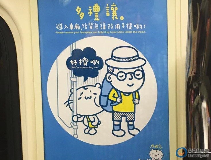 有網友在臉書社團「字嗨」上表示,下班後發現台北捷運的乘車禮儀新文宣。從他分享的照片中可以看到,新文宣有著舒服的粉藍色背景和明亮的黃色字體,中間插圖以簡潔的深藍線條繪出一名揹著後背包的眼鏡男,後面則有一隻被擠到臉的貓貓痛苦地說「好擠喲」,進而帶出宣導主題「多禮讓」,希望乘客進入車廂後,能將後背包改為手提。