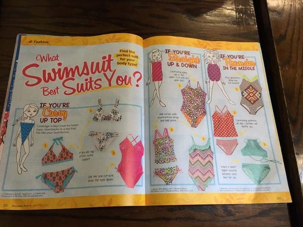美國《發現女孩》(Discovery Girls)在最新一期雜誌中刊登「哪種泳裝適合妳?」的主題單元,教導讀者如何挑選能修飾身材缺點的泳衣。然而因雜誌讀者群定位在8到13歲的兒童及少女,這樣的內容隨即引發家長不滿,認為這會讓小女孩們對自己的身體有錯誤認知,「你們不是應該增進小女孩的自信心才對嗎?」
