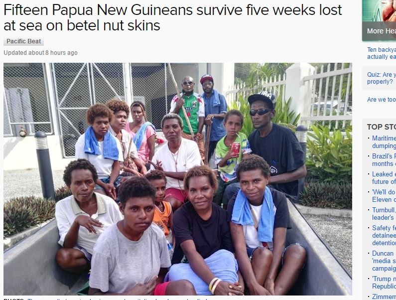 巴布亞紐幾內亞(Papua New Guinea)15人上月4日搭乘7公尺長的船隻,打算從新愛爾蘭省(New Ireland Province)前往利希爾島(Lihir Island),未料中途引擎故障,一群人無助地在太平洋上漂流。依靠著啃食檳榔皮,他們苦撐超過5周時間,直到5月10日才被人發現,最後有14人幸運生還。