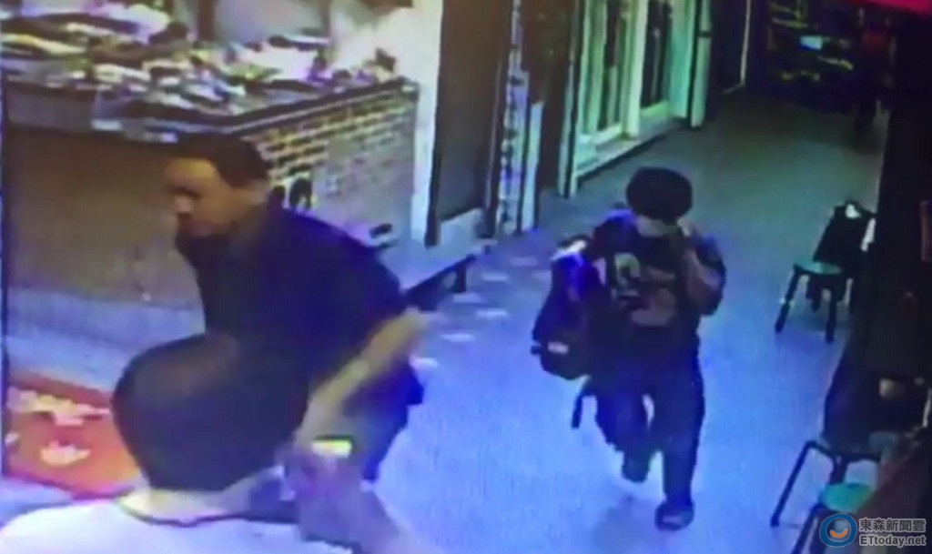 ▲2名搶匪抓著裝有黃金和91萬現金的背包,一前一後逃離現場。(圖/記者楊佩琪翻攝)