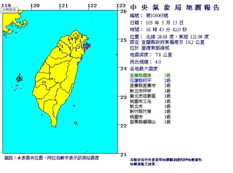 地牛又翻身!宜蘭縣政府東方21.8公里處今天16時24分發生規模5.1地震,地震深度15.9公里,不過,16時43宜蘭又發生芮氏規模4.0的地震,深度8公里,而各地最大部分,宜蘭縣羅東達3級、花蓮縣和平2級。