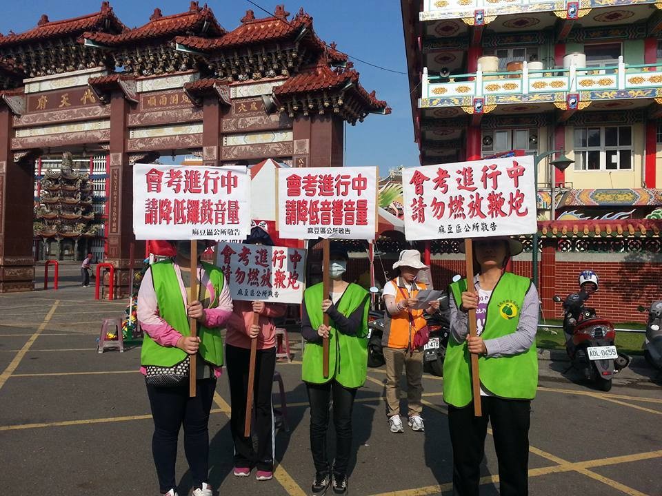 105學年度國中教育會考14日登場,不過台南麻豆區曾文農工考場隔壁就是麻豆代天府,今天也正好是神明生日,麻豆區公所與消防局、衛生所等單位一早便派出志工舉牌,提醒進香團「勿放鞭炮」、「降低音量」,而他們也配合把鑼鼓打得很小聲,現場也沒人放鞭炮,令家長相當稱讚,但也有進香團抱怨熱鬧氣氛都沒了,希望明年能協調把考場移去其他學校。