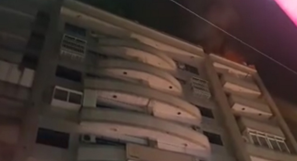 ▼大樓樓頂傳出火警,警消控制火勢中。