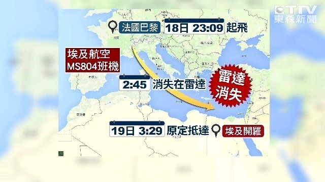 失聯的客機在當地時間19日凌晨2時45分,於地中海上空失聯,當時客機距離埃及領空約10分鐘飛行時間,還在1.1萬公尺高空上,突然從雷達消失,法國及埃及當局都證實客機已經墜毀,且不排除是遭到恐怖攻擊,飛安專家甚至認為,可能是機上炸彈被引爆釀災。