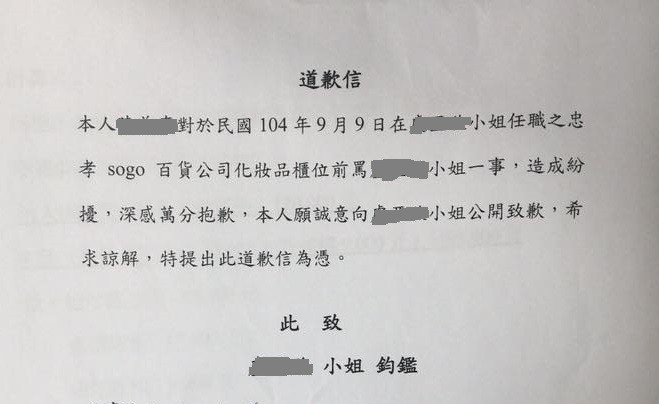 ▲8個月前於忠孝SOGO大聲斥責櫃姐陳婦發道歉信道歉。(圖/翻攝自網路)