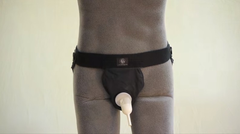 ▲類似保險套外表的隨身尿袋,讓男士隨時都可以「解放」。(圖/翻攝自YouTube)