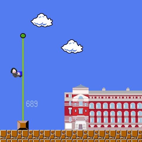 總統蔡英文、副總統陳建仁今天宣誓就職,有網友發揮創意製作動畫,以「一張圖讓全世界都看懂台灣今日頭條大事」為題,讓小英化身為電玩主角「超級瑪莉」,透過「破關」方式拉下國民黨旗,拿下689分跳進總統府。