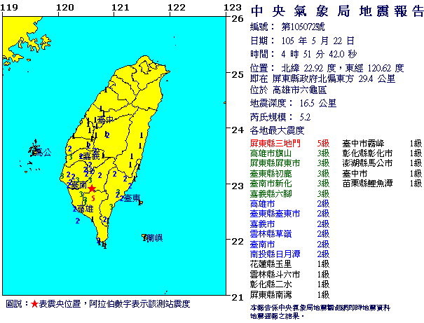 ▲ 高雄市六龜區22日凌晨4點多發生芮氏規模5.2地震。(圖/翻攝自中央氣象局)