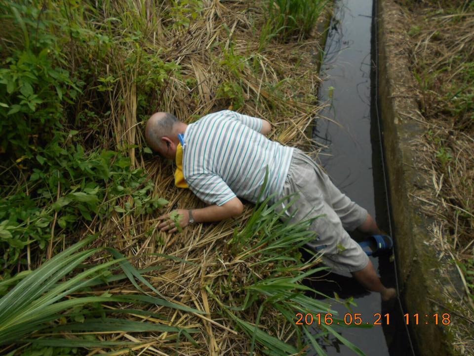 桃園市觀音區一名65歲許姓老翁外出途中,邊走邊用耳機聽音樂,不慎跌落一旁水溝,整個人面部朝下壓在雜草上;所幸巡邏員警立刻將他拉起,避免憾事發生。