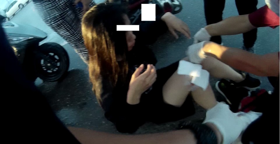 嘉義市政府消防局22日18時22分許接到報案,指稱在學府路忠義橋有民眾車禍受傷!當時這名21歲、穿短褲的長髮女騎士為了閃避流浪狗,失控摔車,一旁店家趕緊報案還幫忙撐傘,就連後方的休旅車也停下來,一起保護受傷女騎士。