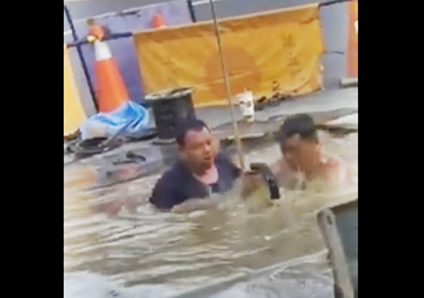 約1分鐘長的影片中,2名工人1人已經脫掉上衣,在漏水區域吊著繩子,輪流潛下水去修理,過程中混濁的泥黃水仍不斷流出路面,他們仍努力下水勘查,討論如何修理。敬業的精神讓路過民眾看了「揪感心」,直呼好辛苦,值得敬重。